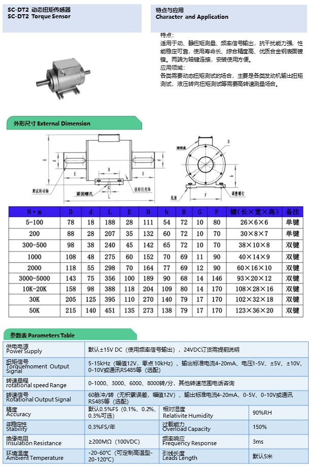 适用于动、静扭矩测量、频率信号输岀,抗干扰能力强,性能稳定可靠,使用寿命长、综合精度高、优质合金钢表面镀镍。两端为轴键连接,安装使用方便。